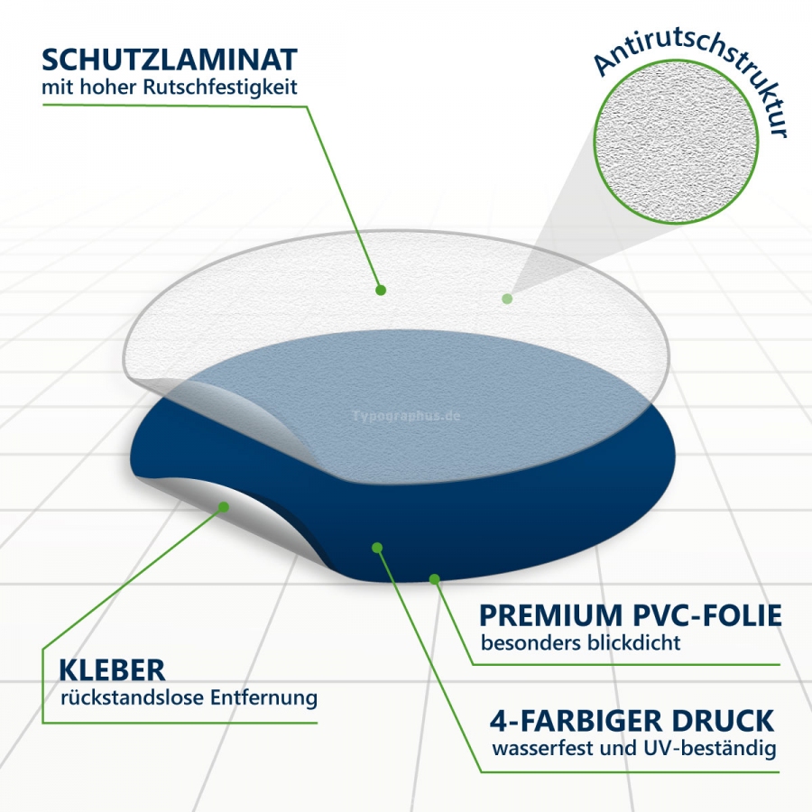 Diese hochwertigen Fußbodenaufkleber für den Außenbereich sind besonders robust und mit einem Schutzlaminat ausgestattet. Die spezielle Oberfläche ist rutschhemmend und somit trittsicher.